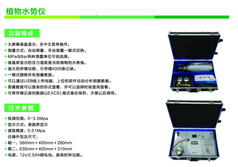 植物水勢儀是用于測定植物水份狀況和它的組成成分及壓去木質部位導管汁液提供成分分析用的一種分析儀器。可以利用此儀器研究植物的水分關系和植物與環境的關系。適用于植物生理學、生態學、農學、林學及牧草等的研究。據此指導作物及林草的合理用水和抗旱育種等工作,是從事農林教學和科研工作的重要儀器之一。它操作簡便,檢測快速,同時適用于室內和室外及野外測量。 植物水勢儀功能特點: